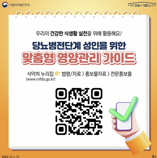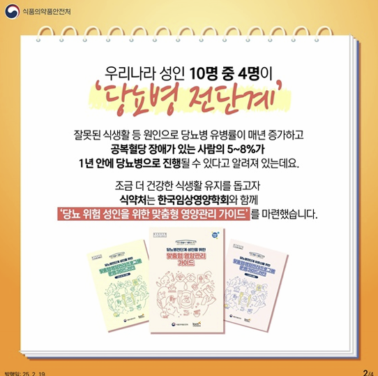 조금 더 건강한 식생활 유지를 돕기 위해 식약처는 한국임상영양학회와 함께 '당뇨 위험 성인을 위한 맞춤형 영양관리 가이드'를 마련했습니다.